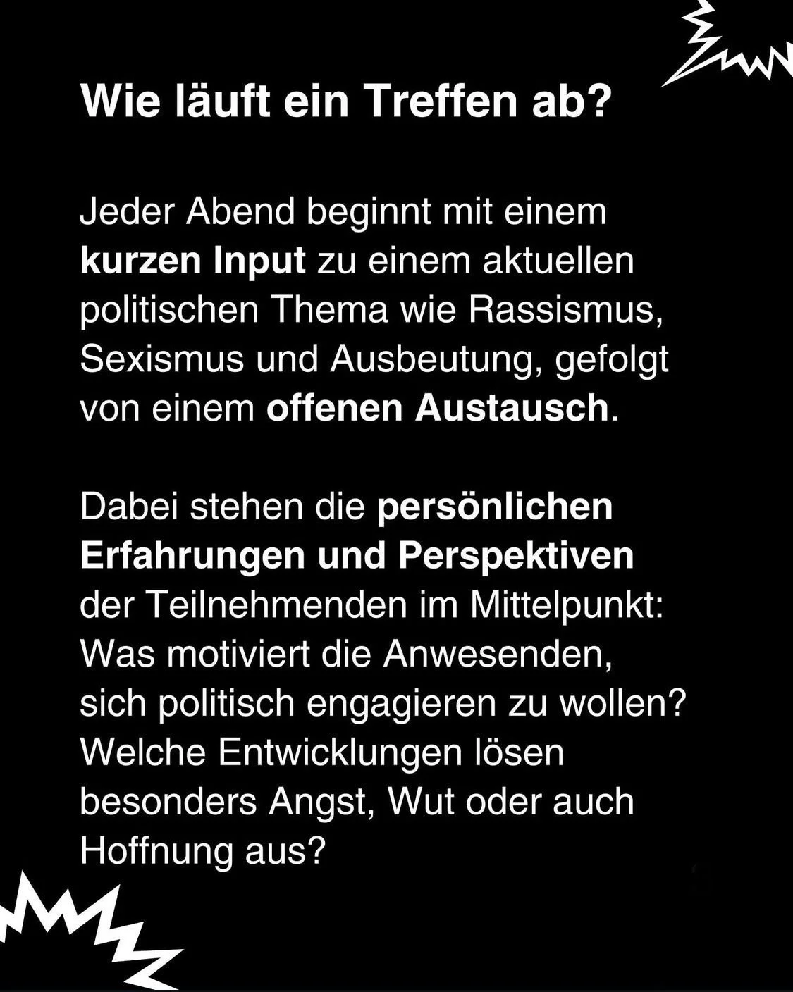 Am Anfang jedes Treffens gibt es einen kurzen Input. Dann stellen einzelne Münchner Initiativen ihre Arbeit vor - und dann sind wir alle gefragt: was machen!?